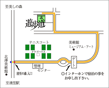 遊歩道は一般観光客の方が入れない閑静な別荘地「清里の森」内にあります。清里の森入り口ゲートのインターホンにて宿泊の事をお申し付け下さい。